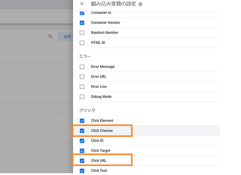 gtm.element.parentNode.className と設定します。ちなみに、親の親のclass(2つ上位でのclass)を指定する場合は、 gtm.element.parentNode.parentNode.className という形になり「.parentNode」を1つ増やす形になります。